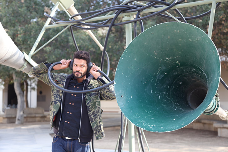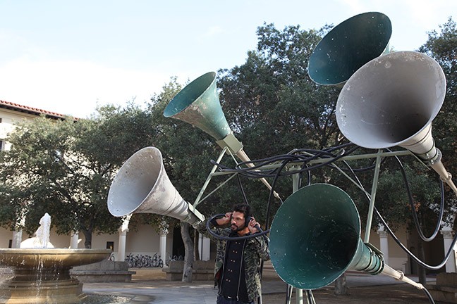 Untitled (Listening Device I), 2013 was installed in front of Frary dining hall at Pomona College for six weeks in the spring of 2014. During this time period, Mann created an active listening performance and design project with students from Pomona and Scripps College.