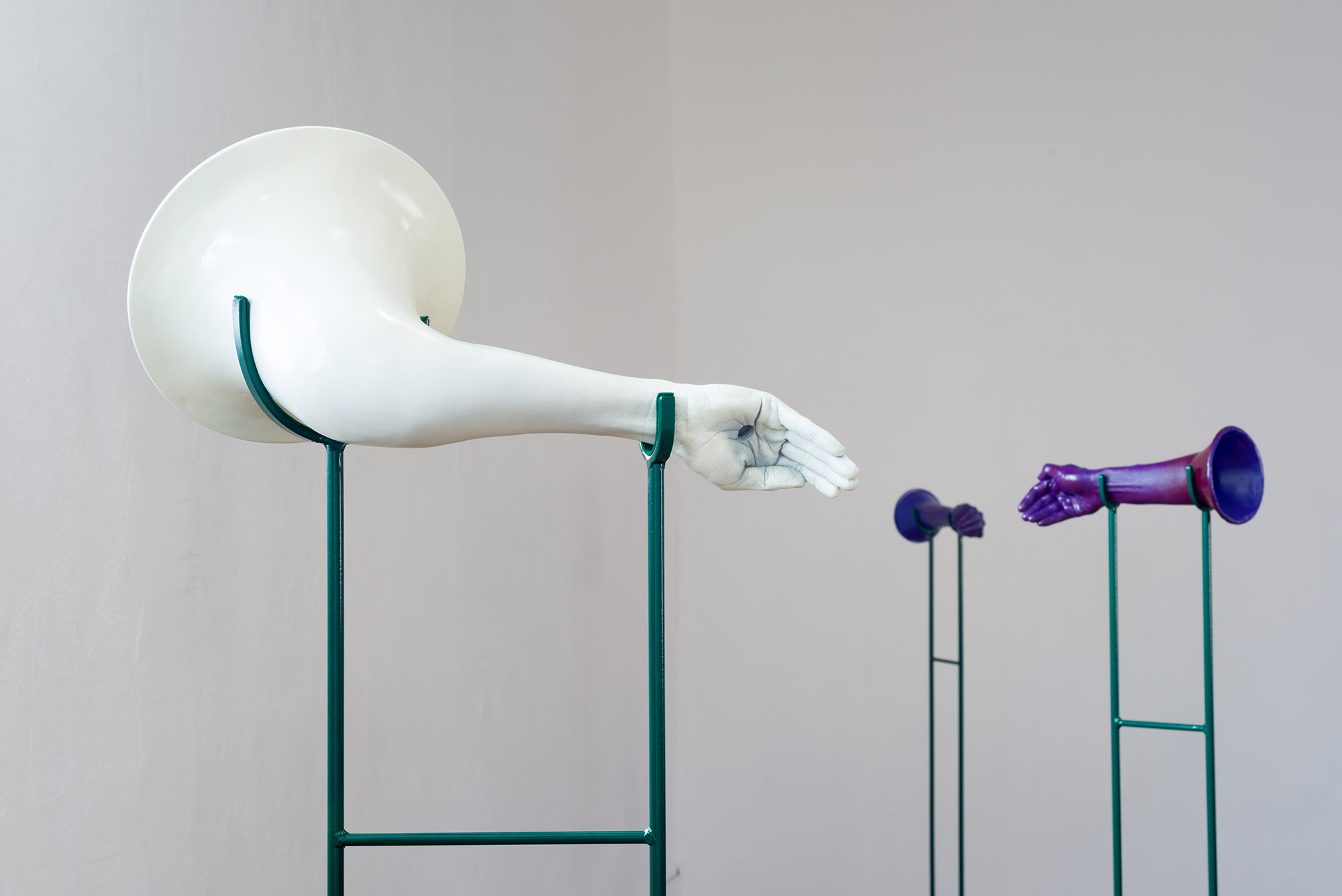 These sculptural instruments, synthesizing casts of the human figure with acoustic properties, demonstrate the symbolic and physical ways vocal sounds travel through the human body and affect the politics of the surrounding world. Hand gestures implemented for “Call to Arms” and “histophones” call out for social justice by literally covering up the mouth of the speaker, while simultaneously amplifying the voice. Whereas “Donald Trump(et)” effectively dampens hate speech by plugging a megaphone with a life cast of an anus, rendering it mute.