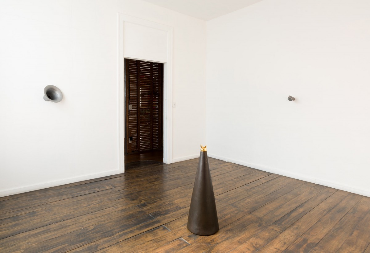 In the exhibition, twenty plastic casts of “hands-up-don’t-shoot-horns” and “histophones” were presented in an armory-like setting, assembled and ready for marches into the streets or heated debates. Aluminum casts of “hands-up-don’t-shoot-horns” and “histophones” penetrated the parameters of the room where the bronze “Donald Trump(et)” listened in silence. This architectural intervention boosted the voices of the people in the surrounding hallways, displacing the political silos most citizens occupy in complicity.