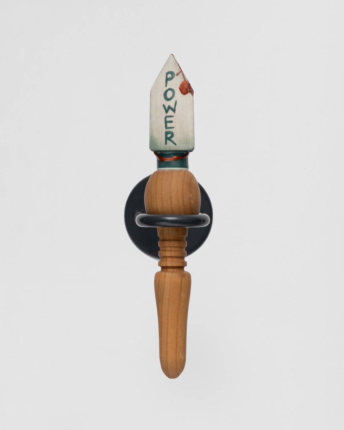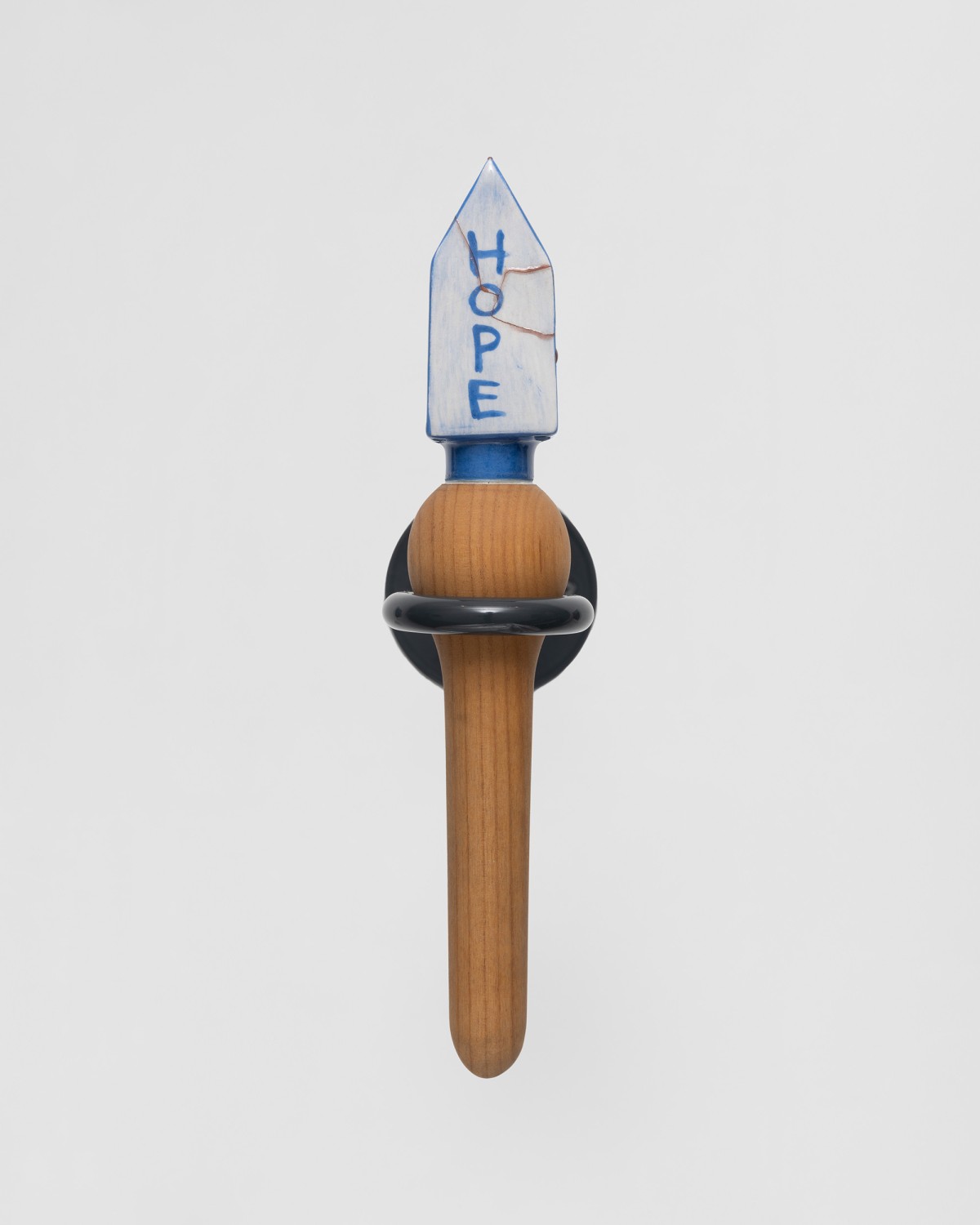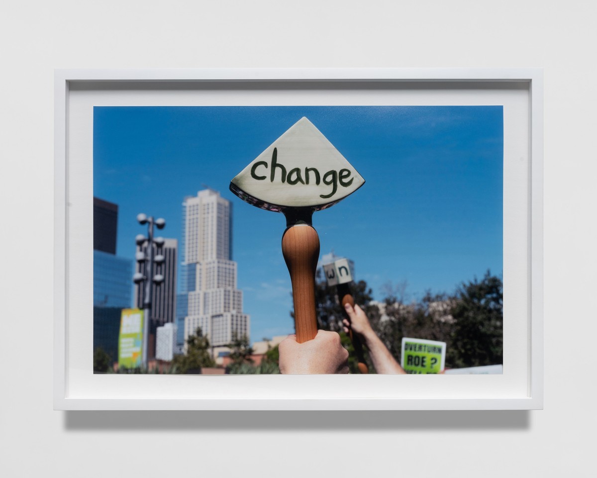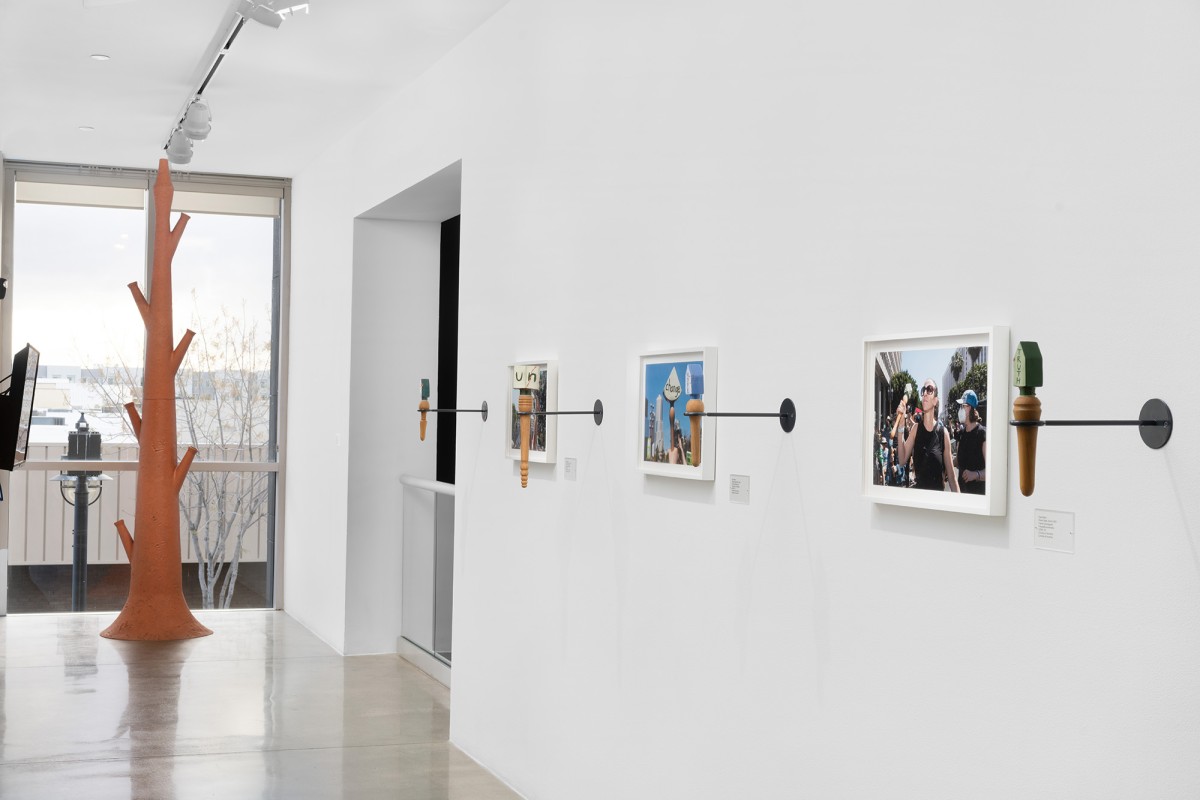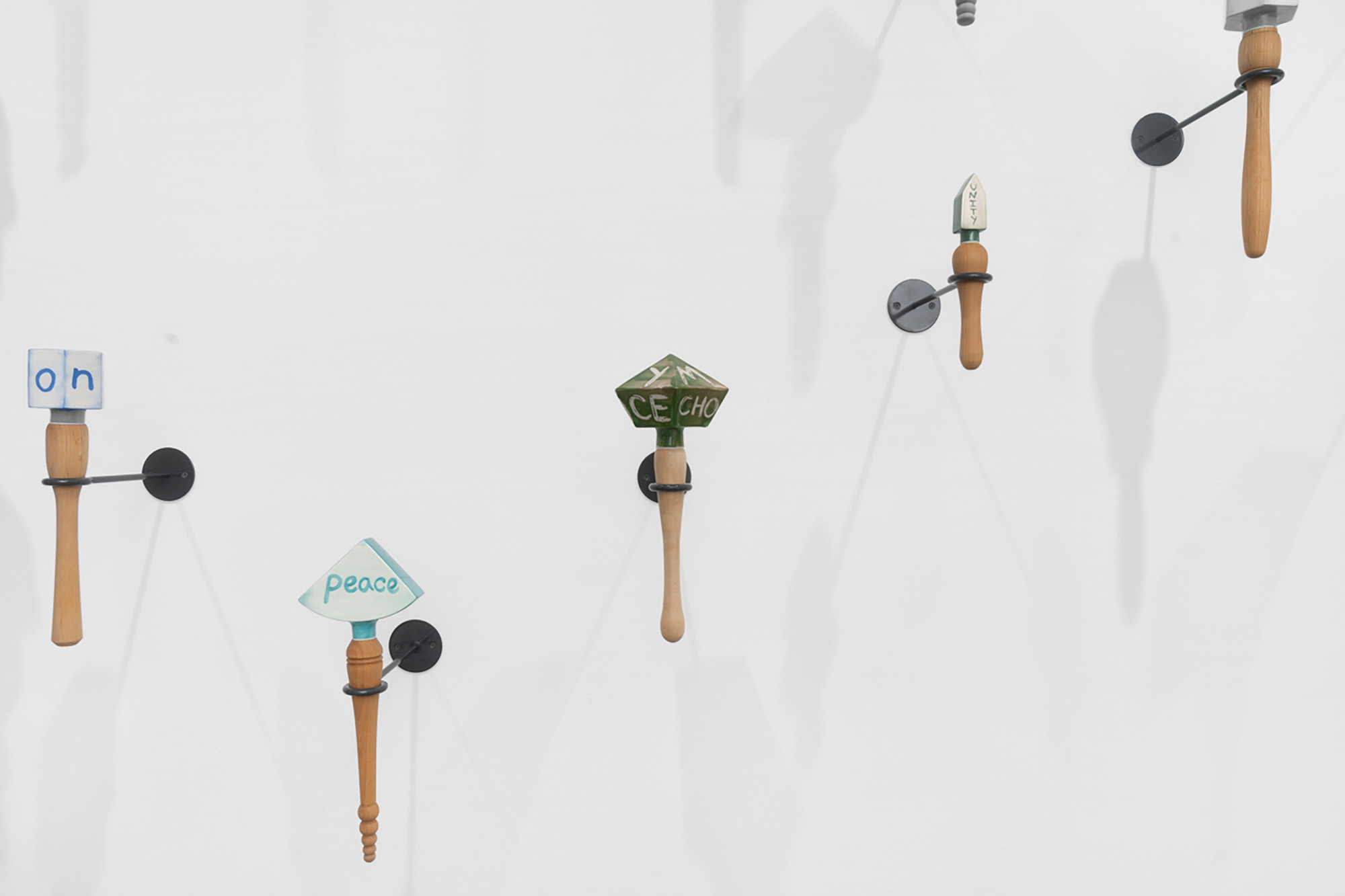 Constructed with a variety of materials, Mann’s rattles, noisemakers, trumpets, and other instruments are tools that galvanize the sonic energy of her work. From large fiberglass horns to smaller handheld ceramic rattles, each of these artworks act as their own distinct voice. When played together, they make up a unique collective unit; a synergistic roar that embodies the voices of those who strive for social change.