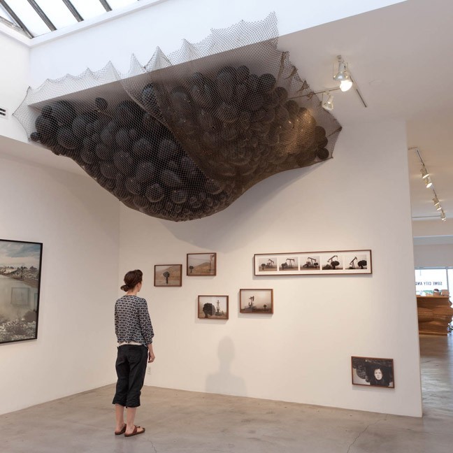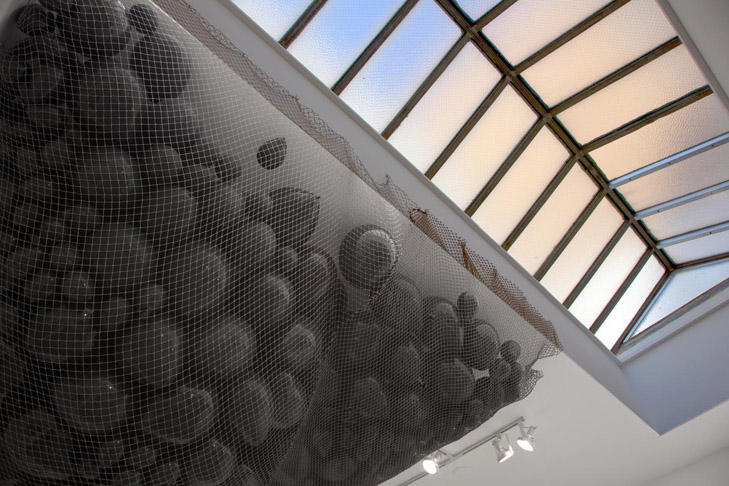 The IBD (Improvised Balloon Device) series is an installation with photographs, balloons, and netting.
