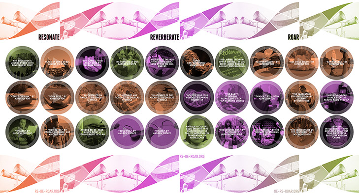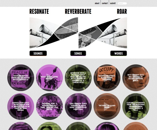 Resonate, Reverberate, Roar (Re-Re-Roar) is a growing archive of original sounds that express an experimental, independent, and socially progressive spirit. The sounds on Re-Re-Roar include field recordings, interviews, songs, speeches, experimental music, and more. Re-Re-Roar is a site for research and activ[ist] listening, with the purpose of distributing sounds of resistance to eager ears around the globe. Visitors are encouraged to add their own sounds of resistance to the archive through the website's submit function.