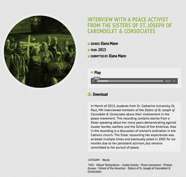 Re-Re-Roar originated from Elana Mann’s collection of sounds of resistance, which she began during the Iraq war in 2007 by recording commuters in Los Angeles and Iraq. The website was incubated during her time as the 2013 Amy M. Sears artist-in-resident at at St. Catherine University, St. Paul, MN, amongst a group of peace activists from the Sisters of St. Joseph Carondelet & Consociates. Re-Re-Roar was designed by Roman Jaster and Nicole Jaffe, with production assistance from Reilo Dahl.