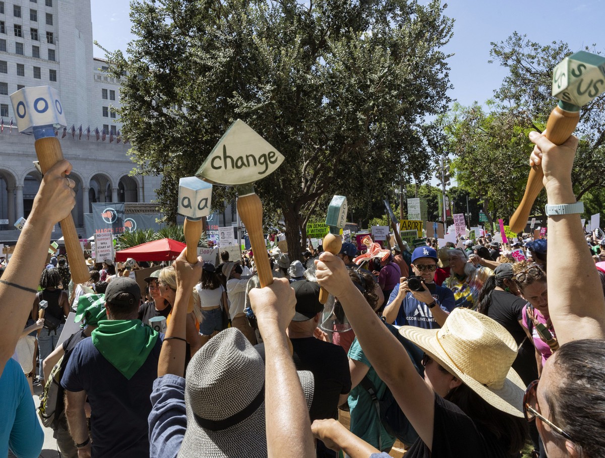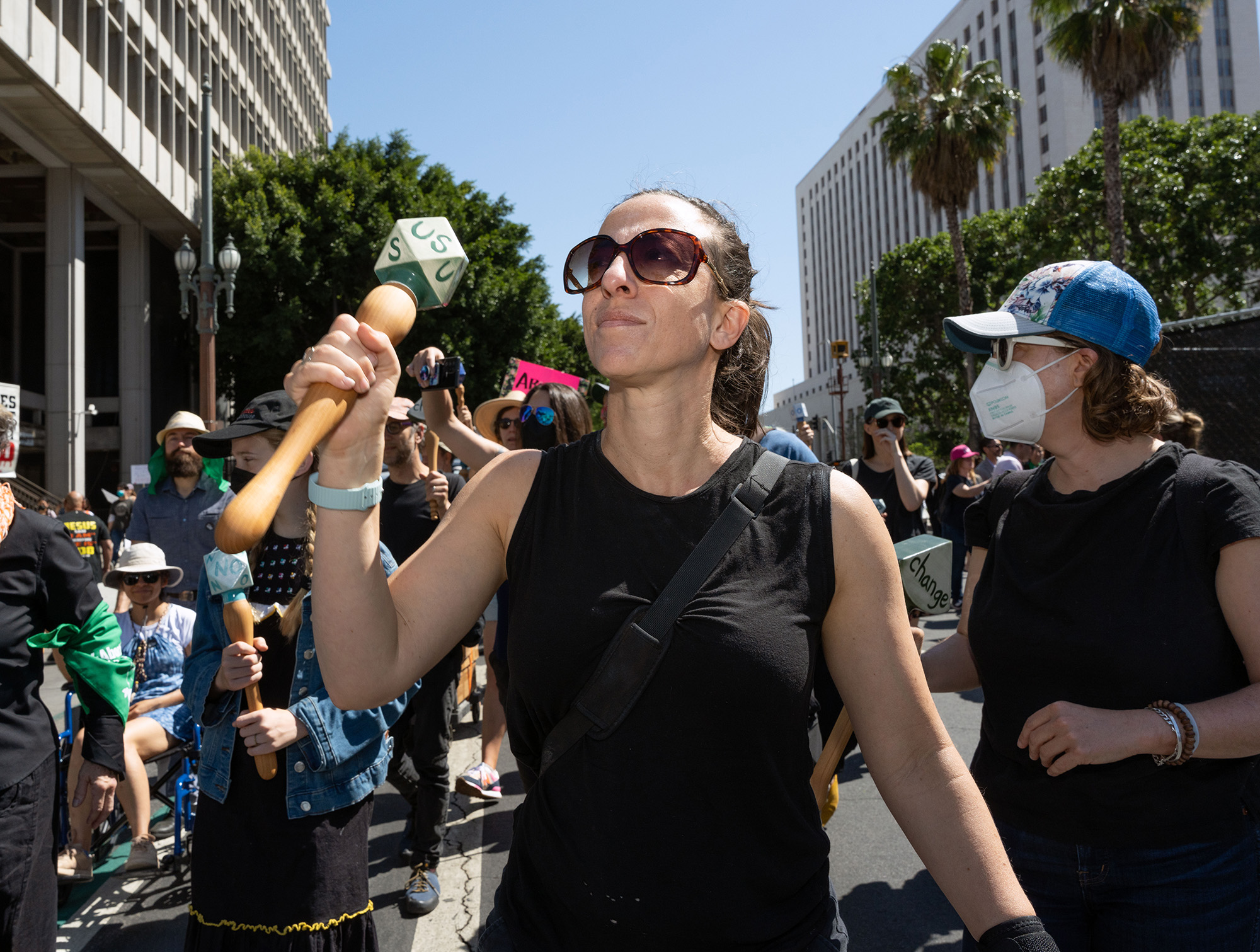 Shake, Rattle, Roll started in 2019 and is an ongiong project through the present. The following images are from an action that took place at the "Bans off our bodies" rally at Los Angeles City Hall, May 14, 2022, hosted by Planned Parenthood, the Women's March Foundation and MoveOn. The rally was organized to condemn U.S. laws banning trans rights and reproductive health access. The protest rattles are designed to bolster energy, voice and political power and have also been used to advocate for immigrant rights and environmental justice. Shake, Rattle, Roll also takes place in domestic settings, where rattles are used to aid in familial/interpersonal communication. Starting in 2024 the project also involves rattle making workshops in a variety of contexts and communities.