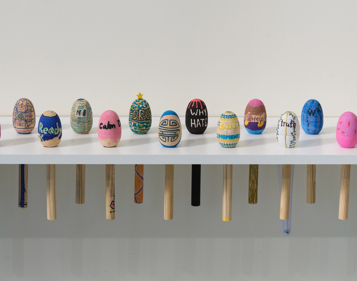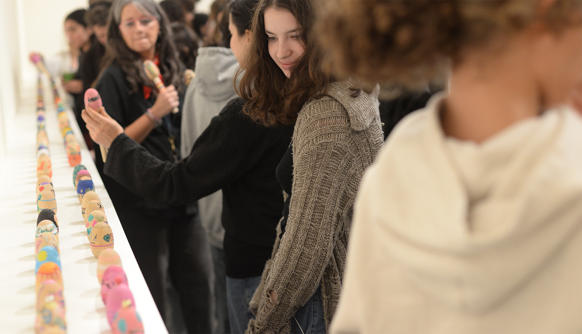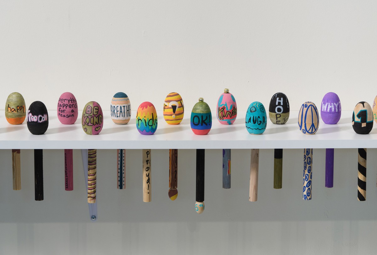 What Can Listening Do? (Part 2) was a socially engaged project by artist Elana Mann, which involved the creation of original sonic instruments for protest and ritual. Mann worked with students from Crossroads School for the Arts & Sciences to produce over 200 wooden shakers with slogans/symbols. The student pieces were displayed alongside a new set of Mann’s signature hand-made porcelain rattles. What Can Listening Do? (Part 2) is part of an ongoing series by Mann (since 2019) involving ceramic rattles, which she uses in group demonstrations on the street and in smaller ceremonies within domestic settings. The project culminated with a large-scale performance that activated the rattles and shakers at the Sam Francis Gallery.