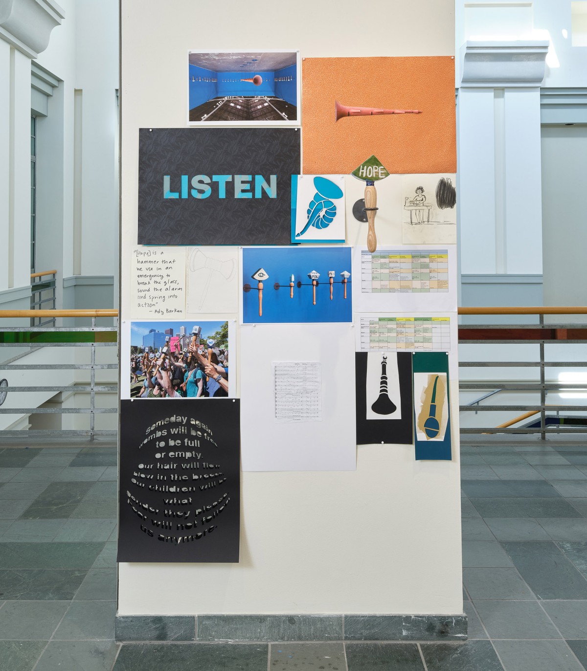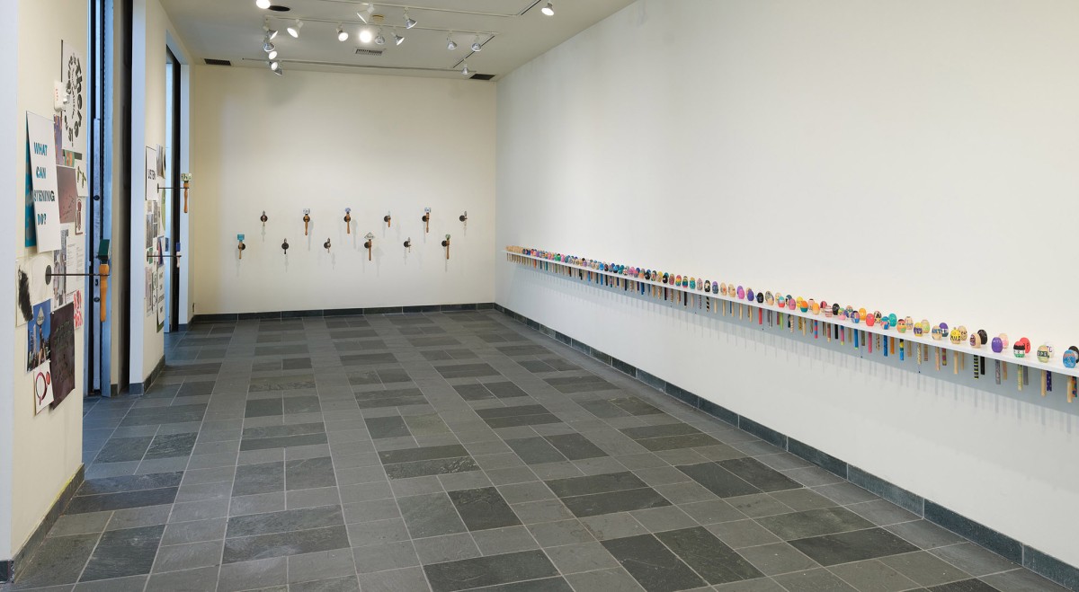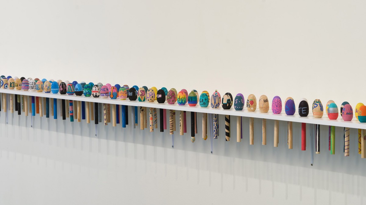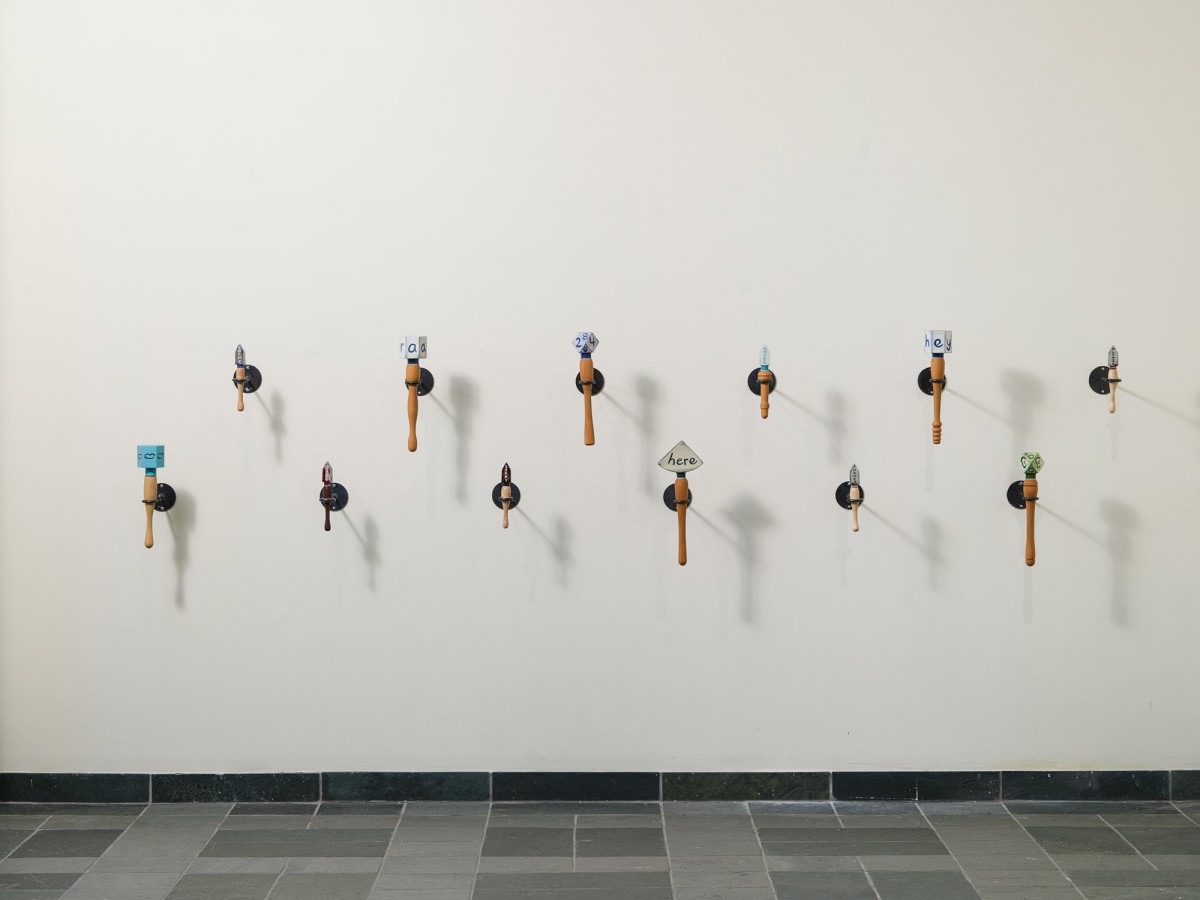 What Can Listening Do? (Part 2) was a socially engaged project by artist Elana Mann, which involved the creation of original sonic instruments for protest and ritual. Mann worked with students from Crossroads School for the Arts & Sciences to produce over 200 wooden shakers with slogans/symbols. The student pieces were displayed alongside a new set of Mann’s signature hand-made porcelain rattles. What Can Listening Do? (Part 2) is part of an ongoing series by Mann (since 2019) involving ceramic rattles, which she uses in group demonstrations on the street and in smaller ceremonies within domestic settings. The project culminated with a large-scale performance that activated the rattles and shakers at the Sam Francis Gallery.