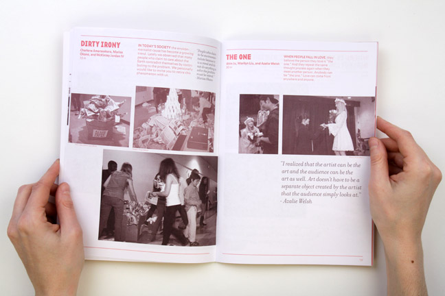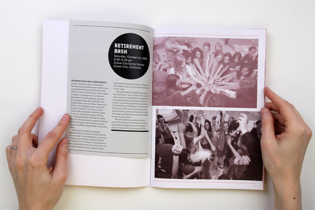 This book was published by the Museum of Contemporary Art, Los Angeles about the project Retirement Bash. Retirement Bash was a performance project created through a collaboration between Elana Mann and Culver City High School Art Students from the Academy of Visual and Performing Arts (AVPA). Mann and the students developed Retirement Bash during a five-week workshop, which included learning about performance art, community outreach, and in-class experiments. At the end of the workshop, the students and Mann presented a three-hour interactive event, where each student performed an original artwork. During the Retirement Bash performance, outdated sayings, symbols, images, and mottoes were performatively “retired” by the students, while new sayings and ideas were introduced. This project was commissioned by the Community Outreach Program of the Education Department at the Museum of Contemporary Art, Los Angeles and AVPA.